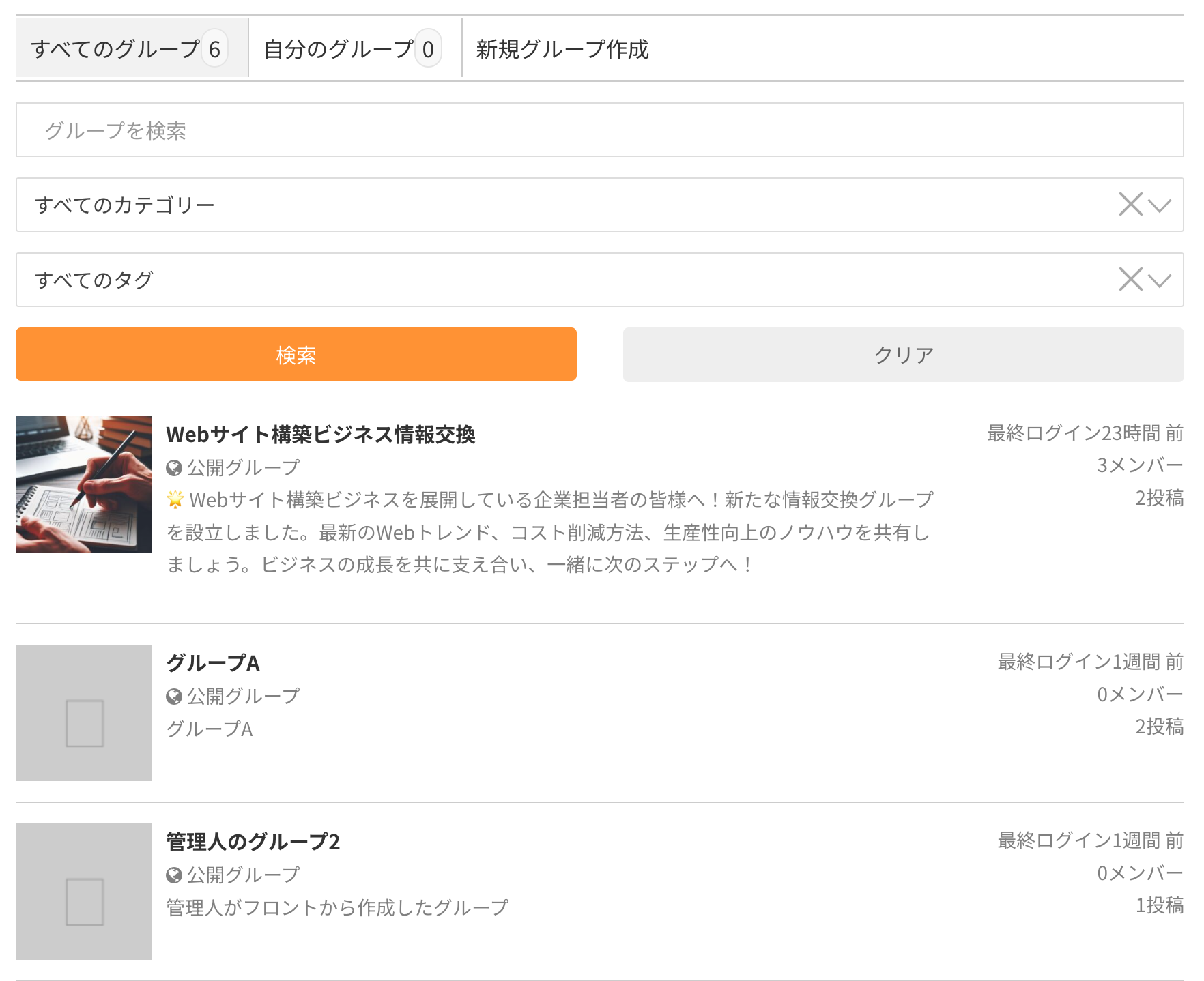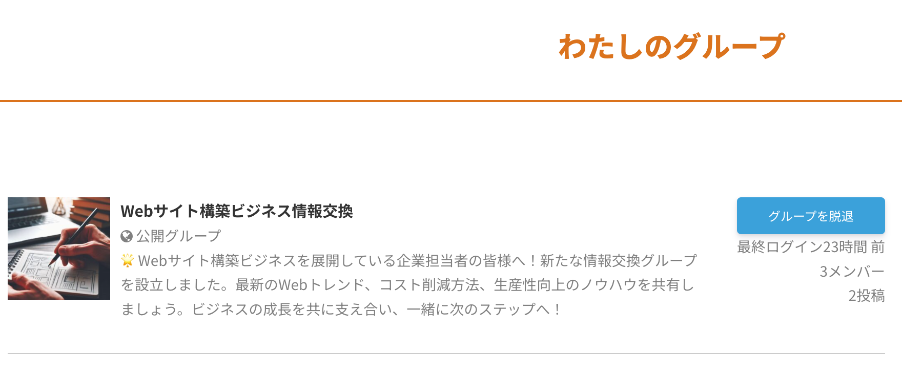 メニューの「自分のグループ」をクリックすると参加しているグループの一覧が表示されます。